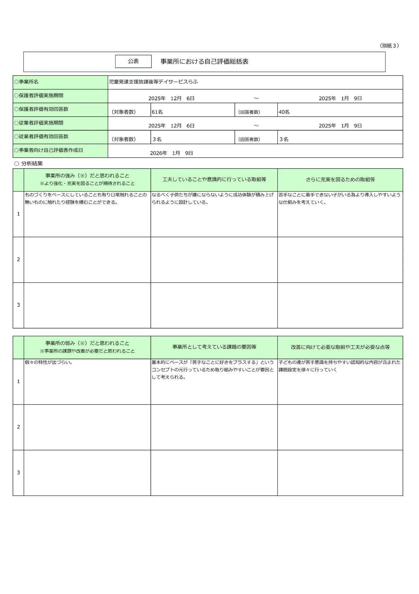 児童発達支援放課後等デイサービスらふの放課後等デイサービスの評価結果についてお知らせいたします。